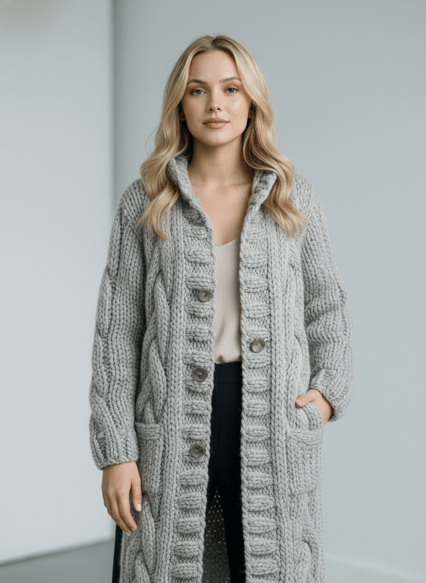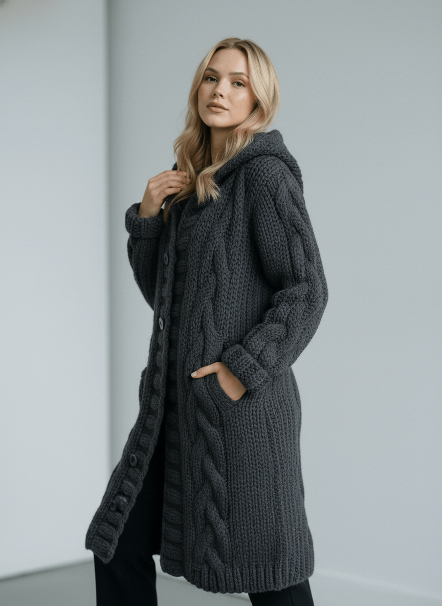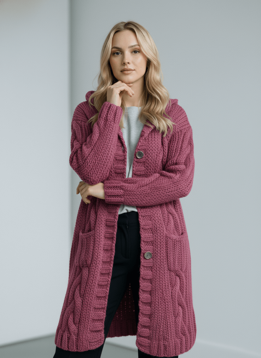 Soft, warm, and comfortable, this chunky knit cardigan combines everyday ease with a classic look. It features a hooded finish and a longline silhouette, adding texture and warmth to layered outfits while maintaining a relaxed, feminine style.