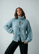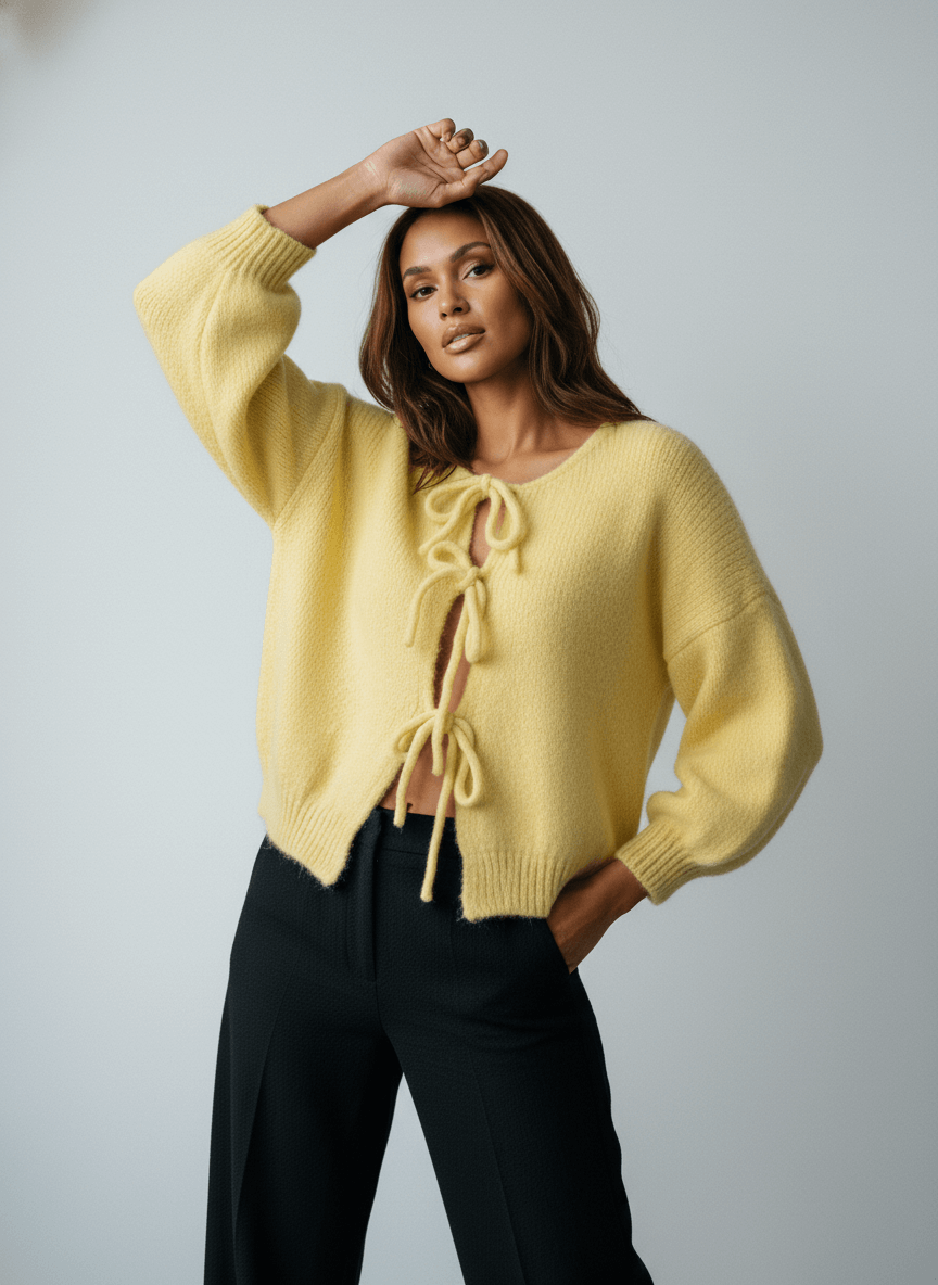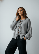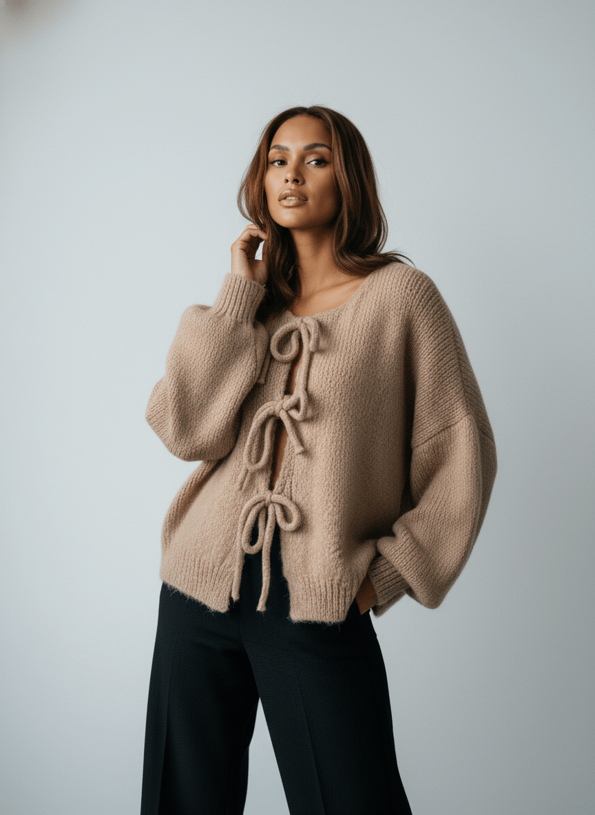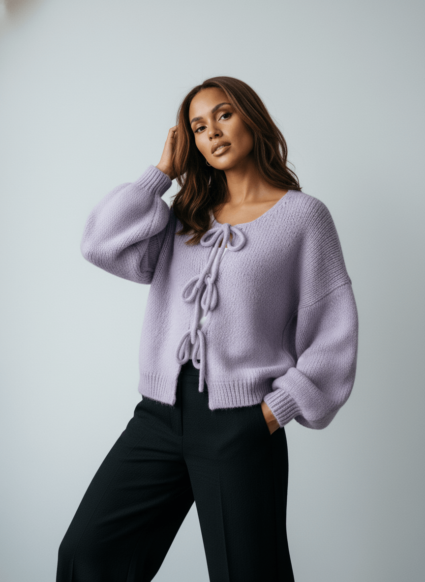 Soft, feminine and easy to wear — this knitted cardigan adds shape and charm to everyday outfits. The adjustable tie-front closure flatters the waist, while the balloon sleeves bring a modern, relaxed silhouette that works for both casual and dressed-up looks.
