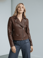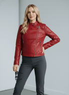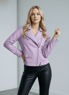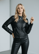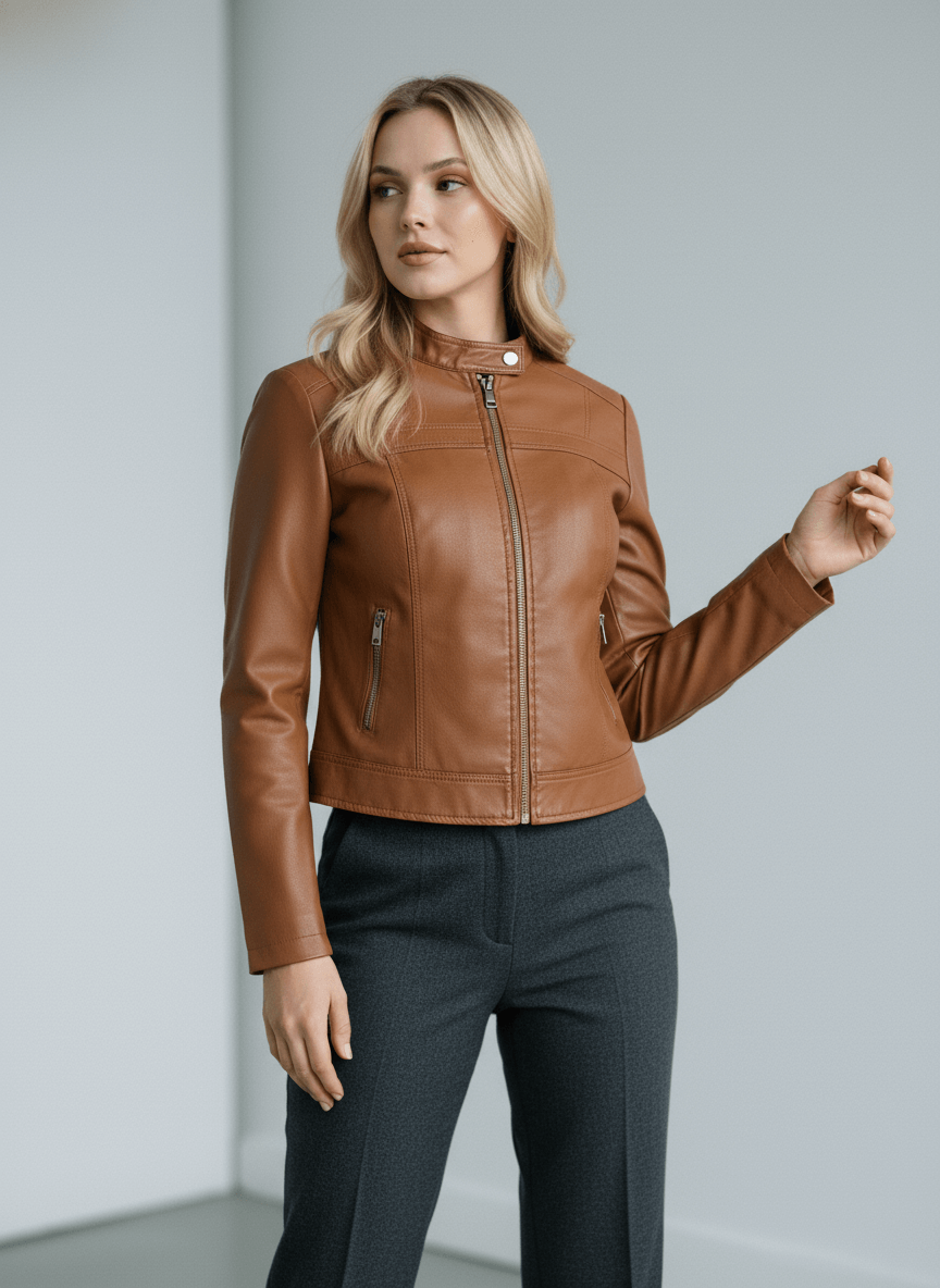 Sleek, structured, and easy to style, this leather-look jacket adds a modern street-style touch to any outfit. It features a high snap-tab collar, front zip closure, and an adjustable waist belt that shapes the silhouette while keeping the design clean and refined.